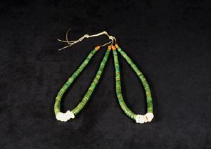 DescriptionHand made, two single strands, used as earrings; beige cotton twine, with orange short barrel European glass beads, varying thicknesses of green turquoise disk beads, kernel shaped, cream with pink and brown shell beads; each is strung with shell beads at center, framed by turquoise beads, and ending with glass beads.This record has been reviewed by University Galleries staff but may be incomplete or contain errors. Our records are frequently revised and enhanced. For any inquiries about the information listed, please email galleries@sandiego.edu.