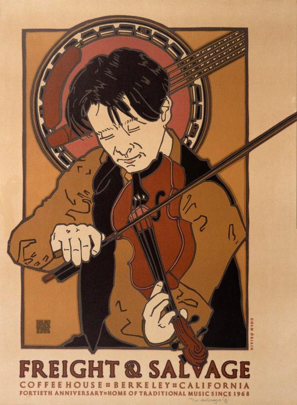 DescriptionA man is thoughtfully playing the violin against a yellow background with a banjo positioned behind his head; text below the image reads "Freight & Salvage Coffeehouse: Berkeley, California: Fortieth Anniversary: Home of Traditional Music Since 1968This record has been reviewed by University Galleries staff but may be incomplete or contain errors. Our records are frequently revised and enhanced. For any inquiries about the information listed, please email galleries@sandiego.edu.