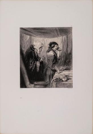 DescriptionA man walks on crutches in profile, though he turns his head towards the viewer. He is draped in a rough cloak, and his hat has a hole through which tufts of his hair emerge. His shoes look to be tied on with string and stuffed with hay.This record has been reviewed by University Galleries staff but may be incomplete or contain errors. Our records are frequently revised and enhanced. For any inquiries about the information listed, please email galleries@sandiego.edu.