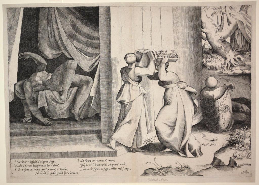 DescriptionJudith, standing center, hands a large platter to her maidservant who carries it atop her head, a piece of cloth falling back to reveal the head of Holofernes. His decapitated body lies contorted on a bed, just inside the doorway left of the two women. To their right, a soldier sleeps, resting on his shield. This engraving is made after the triangular pendentive fresco of the same subject by Michelangelo on the ceiling of the Sistine Chapel.This record has been reviewed by University Galleries staff but may be incomplete or contain errors. Our records are frequently revised and enhanced. For any inquiries about the information listed, please email galleries@sandiego.edu.