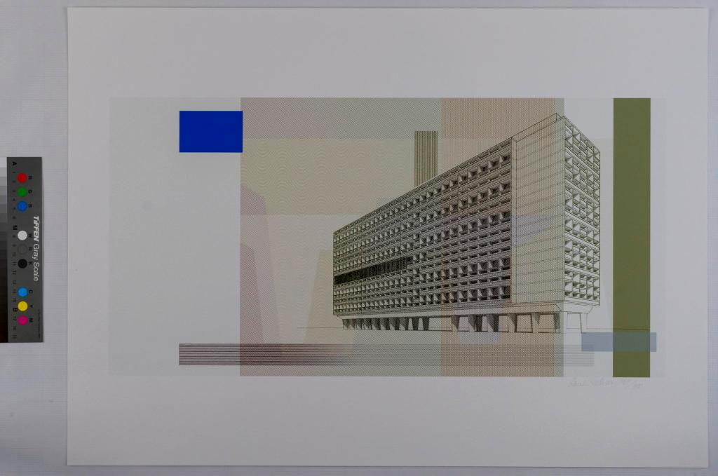 DescriptionLong modernist (international style) rectangular structure raised on piloti recedes from right to left, colored bands in green, blue, and grey are arranged around it; patterns of parallel lines of different colors and directions superimposed over one another creating moiré patterns; resembles an enlarged banknote--the Euro most notably--without text. The building featured is based on Le Corbusier's Unité d'Habitation residential housing design concept, the most famous of which was built in Marseilles.This record has been reviewed by University Galleries staff but may be incomplete or contain errors. Our records are frequently revised and enhanced. For any inquiries about the information listed, please email galleries@sandiego.edu.