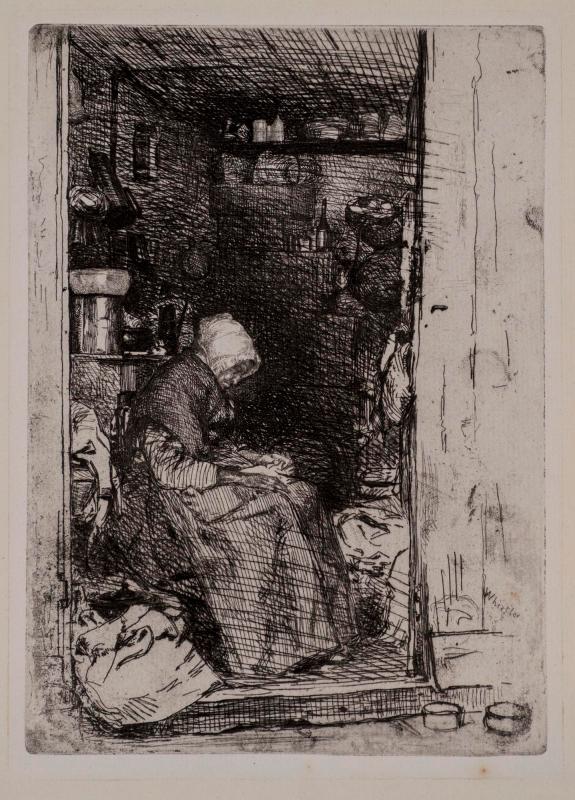 DescriptionA woman sits facing right framed by a doorway with her work in her lap. The small, cramped room behind her is a kitchen, with pans, bowls and a coffee pot on shelves to left, and bottles, boxes and other containers on shelves at the back. More sacks are piled up at the back on the right. At lower right, on the pavement outside the door, stand two small cylindrical pots, such as might contain milk or water for a cat or dog.This record has been reviewed by University Galleries staff but may be incomplete or contain errors. Our records are frequently revised and enhanced. For any inquiries about the information listed, please email galleries@sandiego.edu.