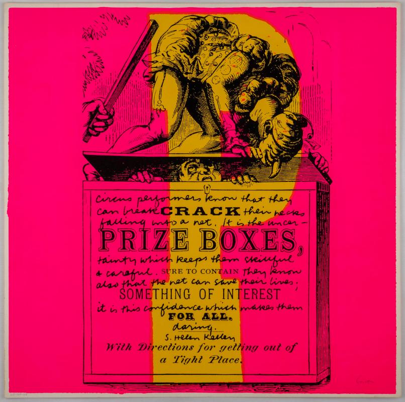 DescriptionYellow P printed on top of a bright pink background. The writing and image are in black. The image is an advertisement for prize boxes; it shows a devious man opening a box which reveals a scared man inside. S. Helen Kelley quote written in the front of the box around the advertisement: "Circus performers know that they can break their necks."This record has been reviewed by University Galleries staff but may be incomplete or contain errors. Our records are frequently revised and enhanced. For any inquiries about the information listed, please email galleries@sandiego.edu.