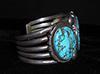 DescriptionHand fabricated cuff bracelet; heavy silver shank split into five narrow bands, and joined at the end with narrow silver bar; three large, mostly oval turquoise cabochons set in serrated bezels, with center stone largest of three; bezels are set on notched base, and four large flattened silver drops surround largest cabochon; dark blue turquoise with gold and dark brown matrices.This record has been reviewed by University Galleries staff but may be incomplete or contain errors. Our records are frequently revised and enhanced. For any inquiries about the information listed, please email galleries@sandiego.edu.