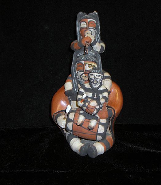 DescriptionHand modeled Koshari storyteller figurine with three musicians: (1) large drummer, (2) medium size flute player on the shoulders of (1), and (3) small drummer sitting on top of large figure's drum; (1) and (3) have a wood twig beater in their right hand, and drum is resting horizontally in lap of (1) and (3); musician (2) is playing a long wood twig flute held in both hands; all are wearing traditional costume of breechcloth, and appropriate facial paint and hair style; (1) and (3) painted black and white stripes, with white moccasins, and (1) has red blanket thrown over his back; (2) has both red and black and white and black stripes vertically separated, and white moccasins; facial paint for two larger figures are red and white with black outlines; smallest figure has only black and white lines; smallest figure has short piece of corn husk atop head.This record has been reviewed by University Galleries staff but may be incomplete or contain errors. Our records are frequently revised and enhanced. For any inquiries about the information listed, please email galleries@sandiego.edu.