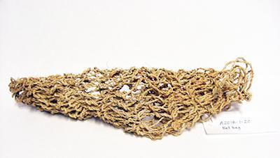 DescriptionHand made carrying net, made of plant fibers woven together to narrow rope and then tied in knots to form net; light brown and tan fibers; net can expand to hold more objectsThis record has been reviewed by University Galleries staff but may be incomplete or contain errors. Our records are frequently revised and enhanced. For any inquiries about the information listed, please email galleries@sandiego.edu.