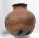 DescriptionHand coiled and paddled Tizon ware jar; artist started with the bottom of an old pot, and made the new base and then added coils to create the globular body, rounded base and wall, constricting to short neck, slightly flared open mouth, and roughly, horizontally flat rim; restricted vessel; orange-brown ground with gold flecks from micaceous clay; multiple gray, light orange, and black fire clouds.This record has been reviewed by University Galleries staff but may be incomplete or contain errors. Our records are frequently revised and enhanced. For any inquiries about the information listed, please email galleries@sandiego.edu.