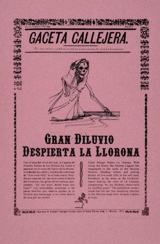 DescriptionBroadside with calaveras and three columns of verse. Two front-facing, full length calaveras in finery on either side of the title. Two half-length calaveras facing each other beneath the title. Skulls and bones arrayed along bottom edge of composition.This record has been reviewed by University Galleries staff but may be incomplete or contain errors. Our records are frequently revised and enhanced. For any inquiries about the information listed, please email galleries@sandiego.edu.